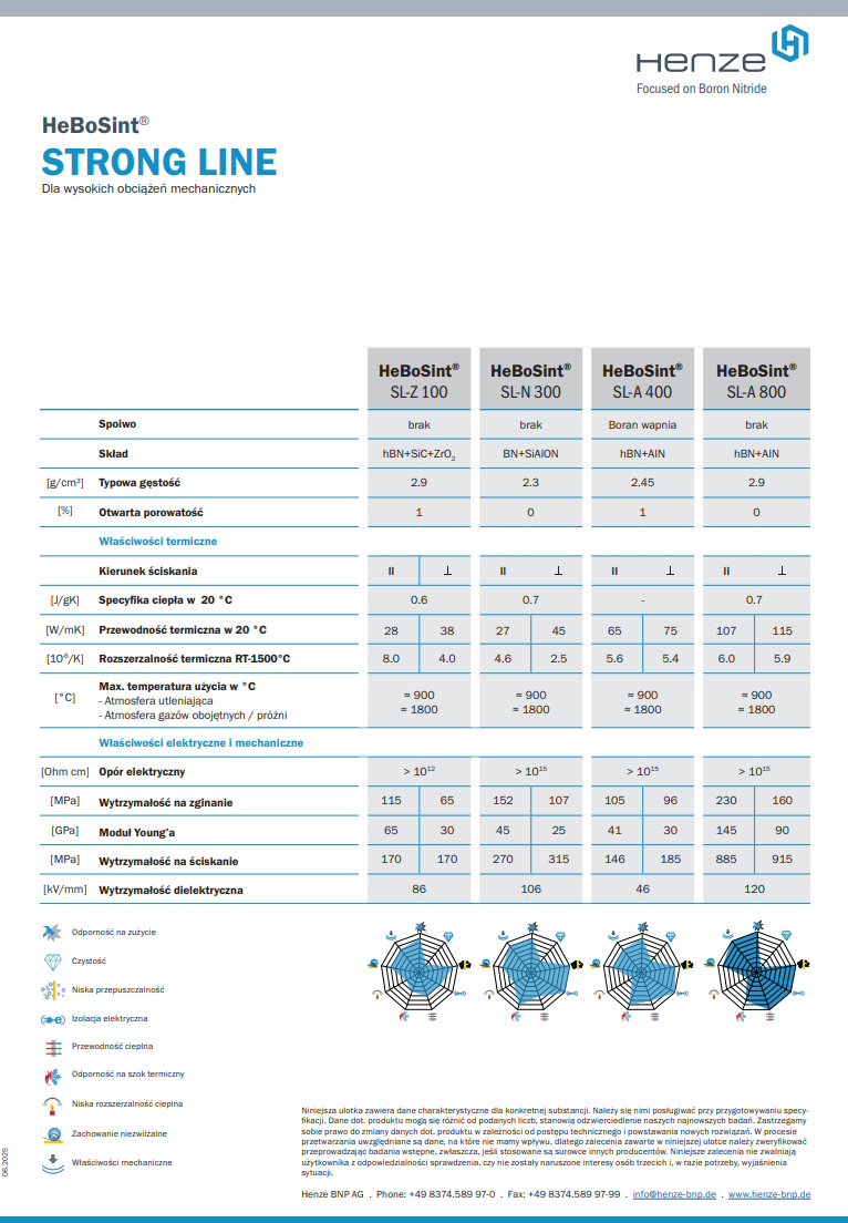 HeBoSint® SL-A 800 to nowo opracowany, wysokowydajny spiek ceramiczny mieszany na bazie azotku glinu i azotku boru. Materiał łączy doskonałą przewodność cieplną z imponującymi właściwościami elektrycznymi i mechanicznymi – idealny do zastosowań w technologii półprzewodników, elektronice mocy, produkcji szkła specjalnego, technologii rentgenowskiej i lotnictwie.